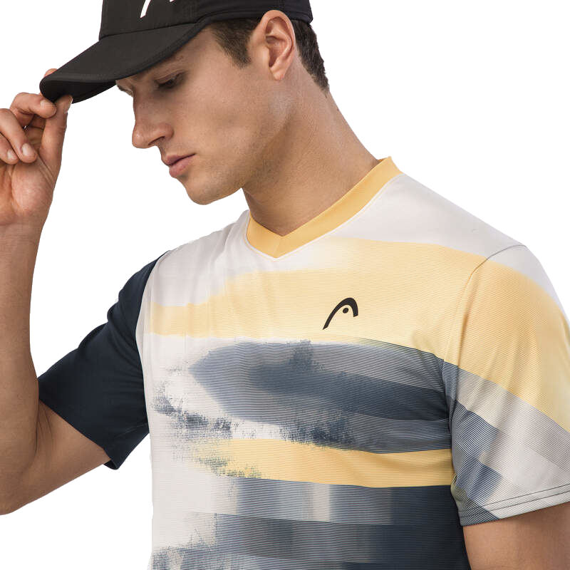 1. #description#Avec un dos en mesh pour une meilleure respirabilité, le T-SHIRT TOPSPIN hommes vous aidera à rester cool en assurant un design frais, original et coloré. Fabriqué à 100  % en polyester, le t-shirt dispose d’un col V plat et d’une bande de propreté HEAD pour encore plus de style. Choisissez entre un motif aquarelle ou un imprimé « Glitch » qui ressemble à un écran vidéo distordu.